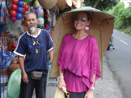 Y la cuarta es probándome sombreros en Bali…..Los que hombres y mujeres usan para sus plantíos de Arroz!!!!!! Lo Maravilloso que tiene Bali es la magia que se percibe en Todo….Las creencias de las personas, sus ofrendas, sus colores, la variedad en sus sabores y especias….La personas son amabilísimas y honestas. Existe una seguridad tremenda ya que no hay criminalidad. Esto se debe a que se tienen creencias muy arraigadas de el castigo a través del karma, las reencarnaciones etc. Existe un sentido de Comunidad Impresionante……Es ruidoso, lleno de sonidos y música de las Gamelans (especie de marimbas) por todas partes…..La vida es alegre y lleno de arte en cada esquina…….Y para comprar de todo y a todos los precios.”